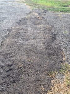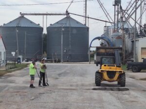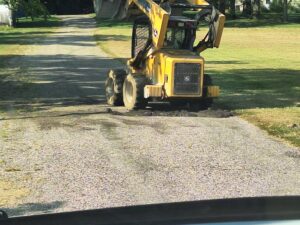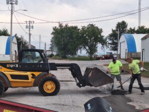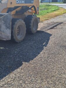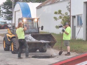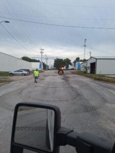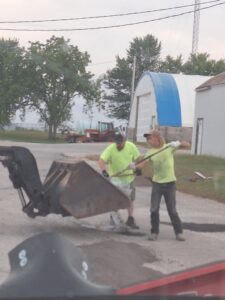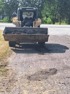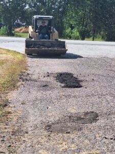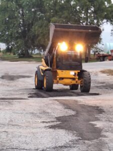 September 2025 saw some road work completed in Dana. Six pallets (almost 7 tons) of “cold pack” rock asphalt were delivered to Dana for the project, with the goal of filling in some of the worst areas of road degradation in the city. Mandy, Tony, and Sean made a trial run with one pallet on the 18th, using a skid-steer graciously loaned by the Crouse family for the project. It was determined that the loader wasn’t big enough to handle an entire pallet of material, so the city needed to rent one from Rueter’s in Grand Junction to finish the project.