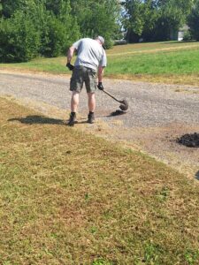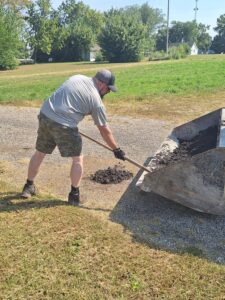 The telehandler from Rueter’s arrived on Sunday the 21st, and work began on Monday the 22nd. Three more pallets of material were spread that day, with the remaining 2 pallets spread on Tuesday the 23rd. New Dana resident Luke joined us for part of Monday’s work and all of Tuesday’s work. That extra pair of hands was greatly appreciated!